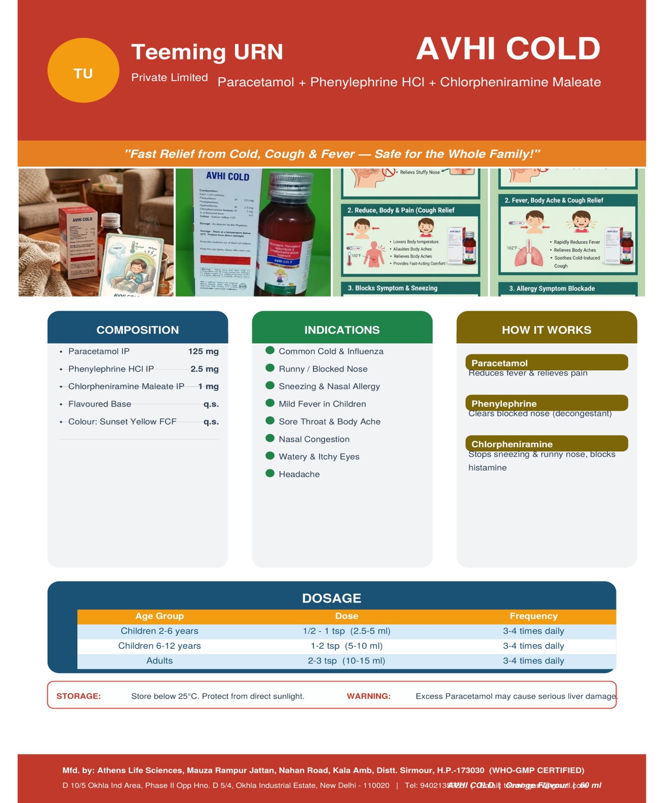 - Composition: Paracetamol + Phenylephrine + Chlorpheniramine