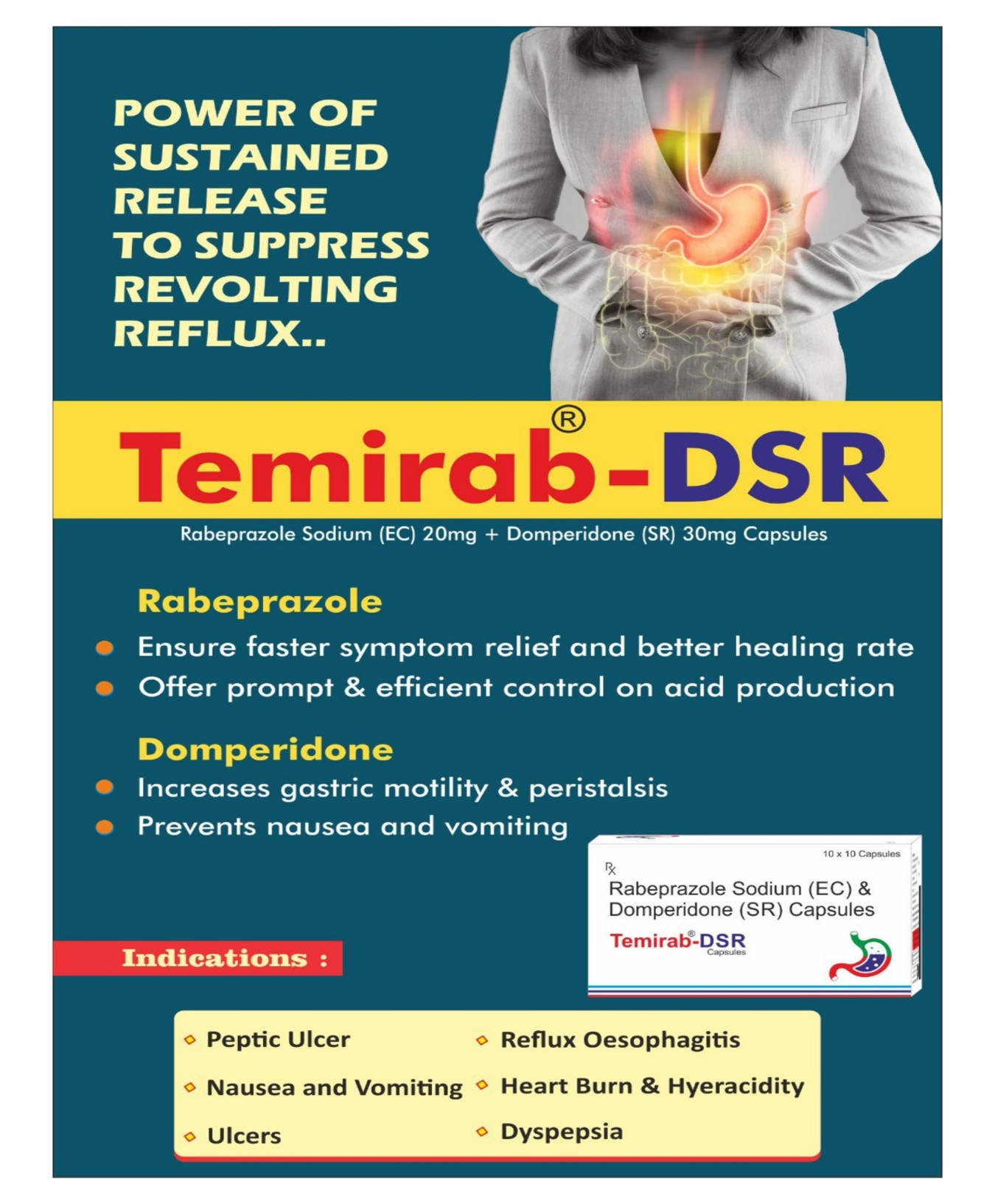 - Composition: Rabeprazole 20mg + Domperidone SR 30mg