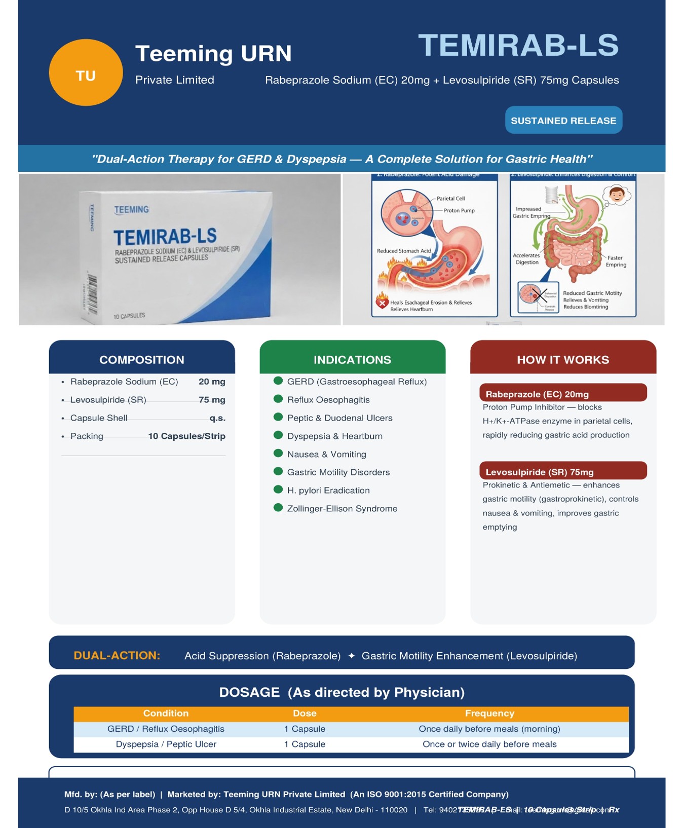 Composition: Rabeprazole + Levosulpiride - Description: Dual-action sustained-release capsule that controls acid and enhances gastric emptying for better reflux management.